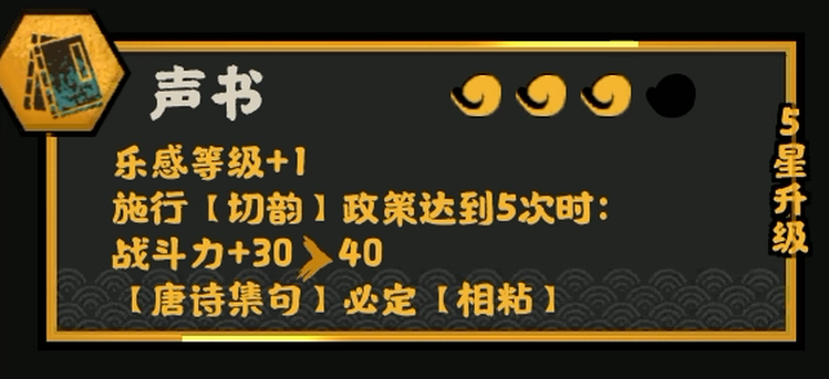 二政策【声书】:乐感等级+1,施行【切韵】政策达到5次时:战斗力+40,【唐诗集句】必定【相粘】。由于陆法言本身没有【唐诗集句】的功能,所以得和其他诗人配合才能完整发挥这个政策的作用。相粘对比不粘,一来一去有5诗意和2灵犀的差距,算是锦上添花。