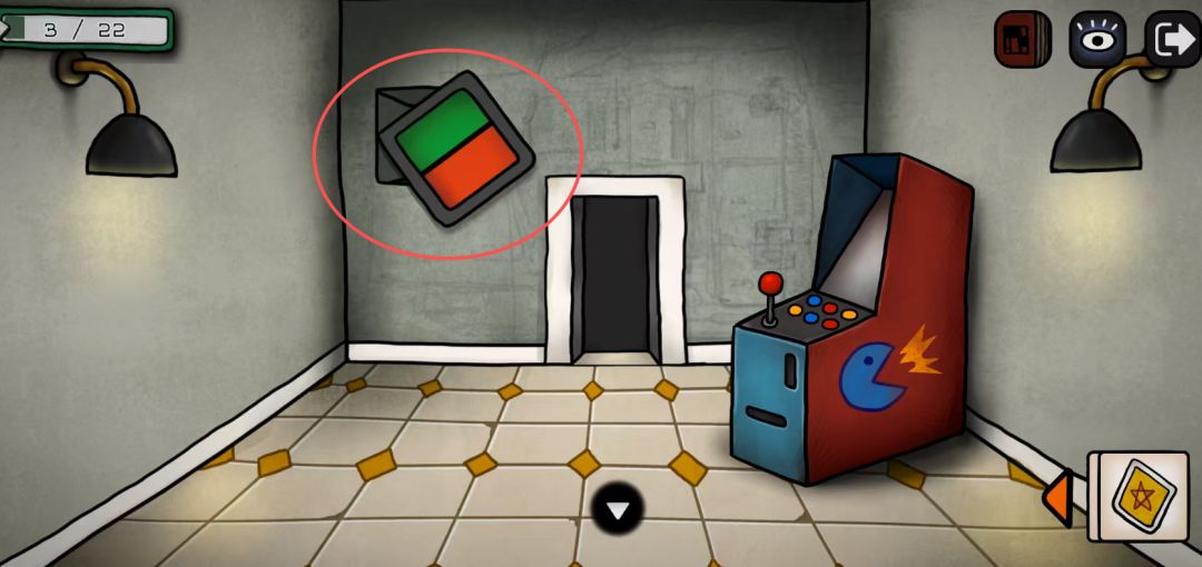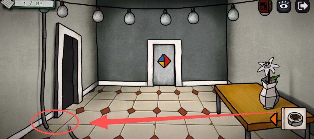 灯泡亮起,根据灯闪的颜色顺序按后面门(和几个灯泡亮没有关系,红色一开始闪了2次),所以是红红蓝黄蓝红黄;点击中间的灯泡,可以获得道具灯泡,这里别忘了拿;