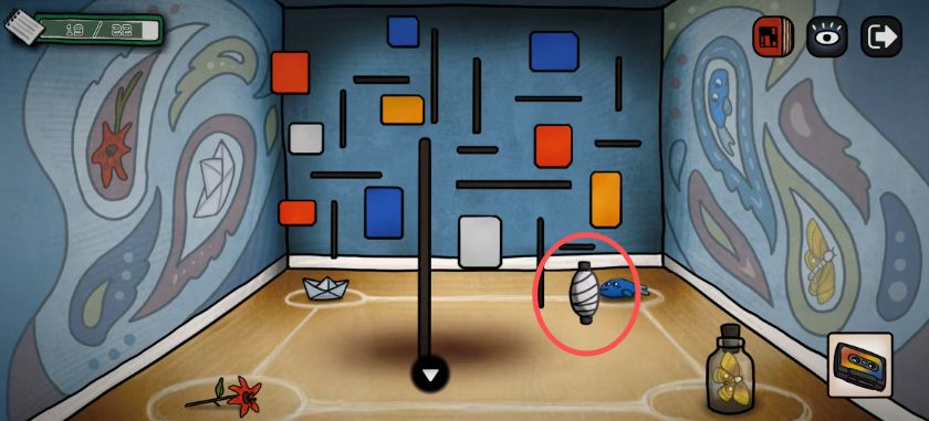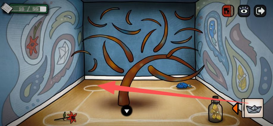 把纸船、花、扑棱蛾子、蓝色的鱼,按照下图这样摆好,获得道具线