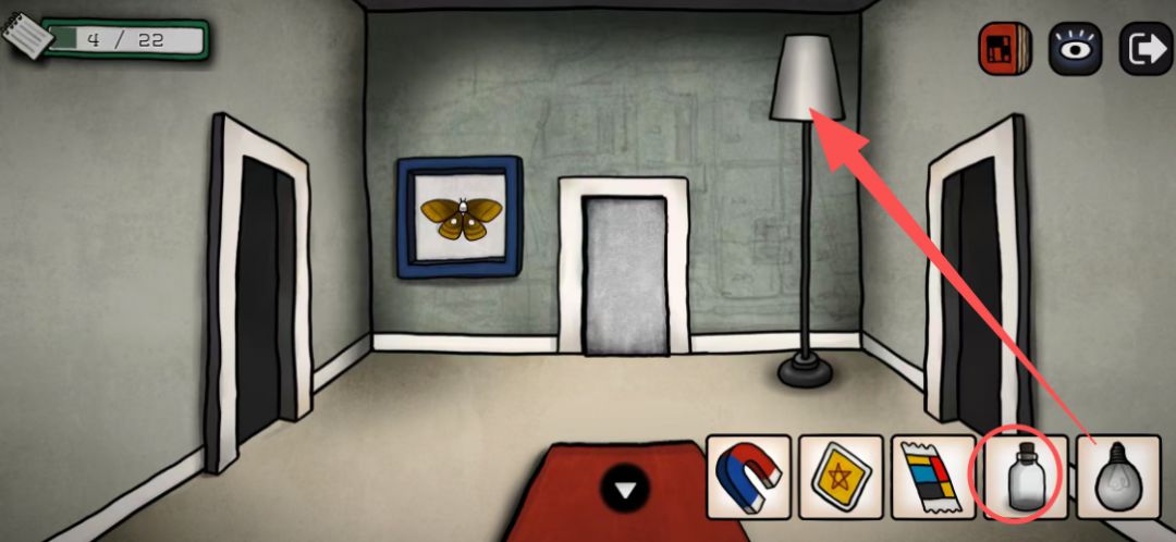 在红毯的房间,把灯泡换上去,然后用瓶子把蝴蝶装起来