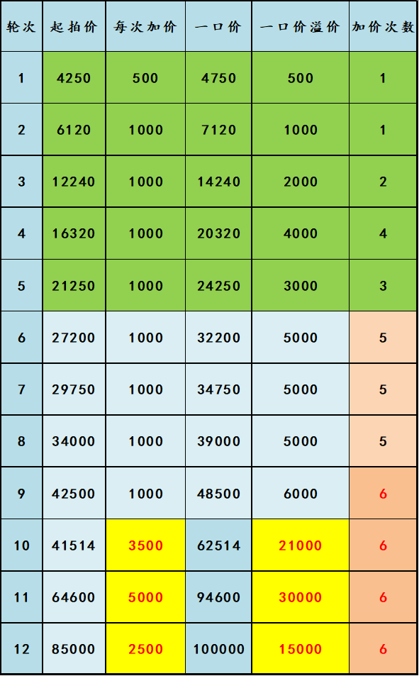 2、第一天开始共计5场竞拍,每一场12轮;活动期间完成即可。