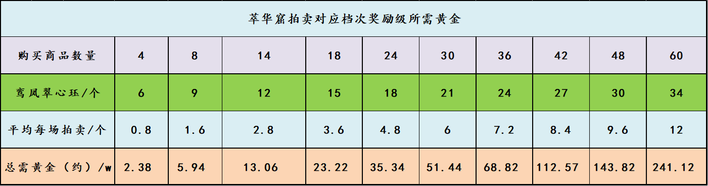 1、新手期,除了每天在萃华消费32000黄金外,拍卖场尽量选择够到30档,因为这一档平均每场只需要拍卖6个物品,黄金压力相对较少;