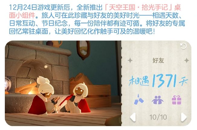 光遇12月24日上新‘拾光手记’小组件!记录好友时光、寄思念信件,添加就领爱心和光能药剂奖励哦~