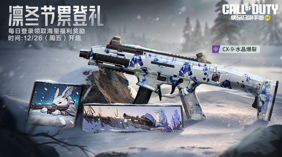 12月26日(本周五),凛冬节累登礼活动上线。战士们累计登录游戏,即可获得史诗级武器CX-9-水晶爆裂,千万别错过哦~