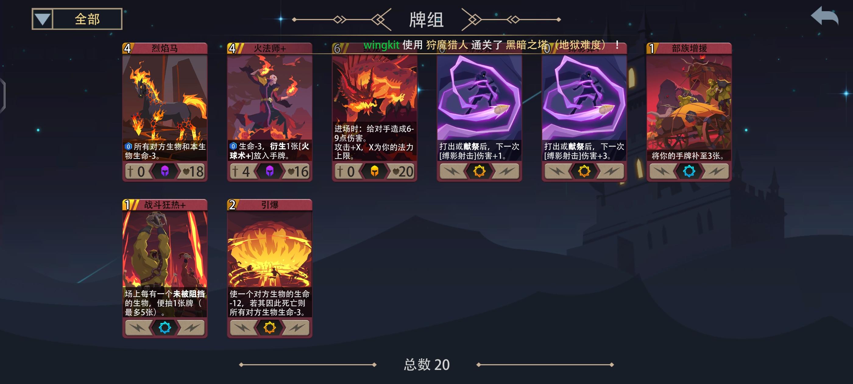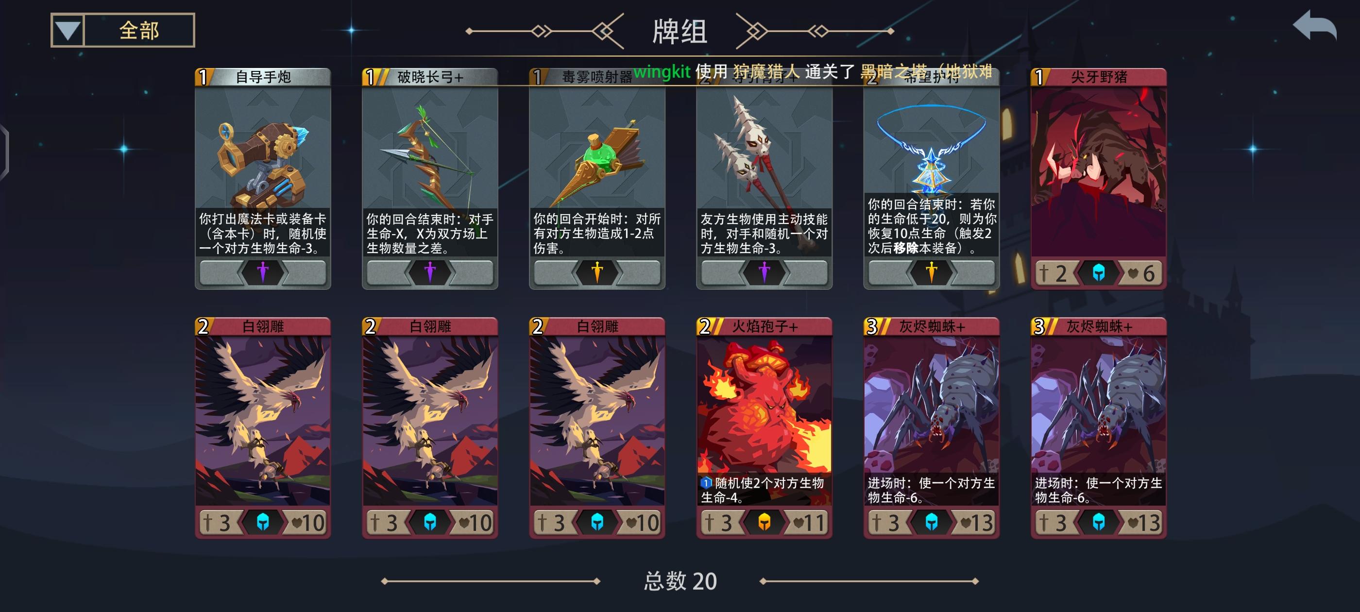 理想卡组:过牌(2~3张)清场卡(2~3张)直伤卡(2张)英雄装备(5张)卡牌厚度:(20~22张)