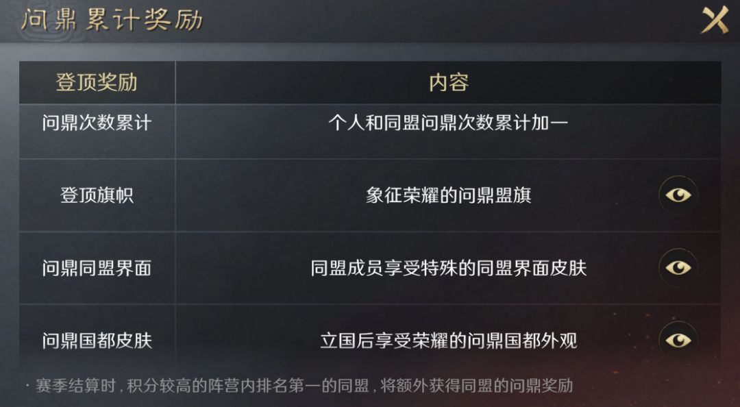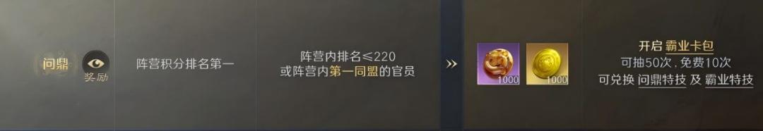 阵营积分排名第一,阵营内排名≤220或阵营内第一同盟的官员可获得问鼎奖励。