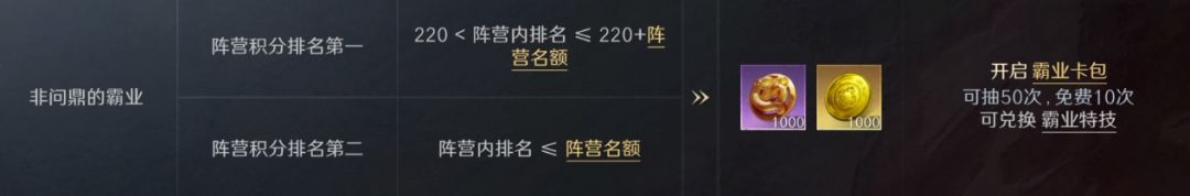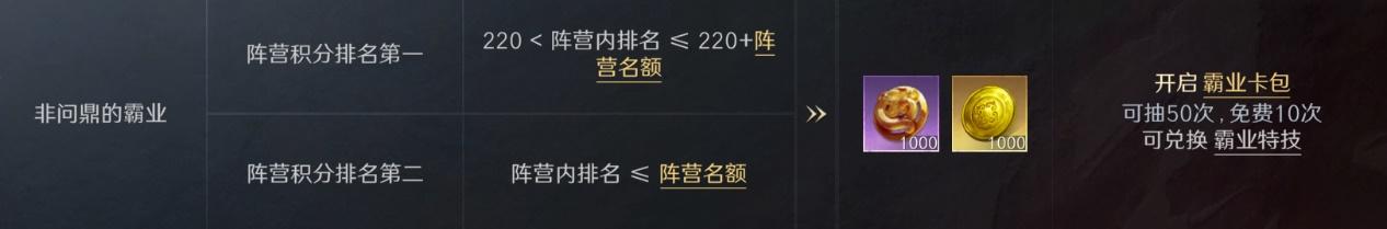 阵营积分排名第一,220<阵营内排名≤220+阵营名额,可以获得非问鼎的霸业奖励。