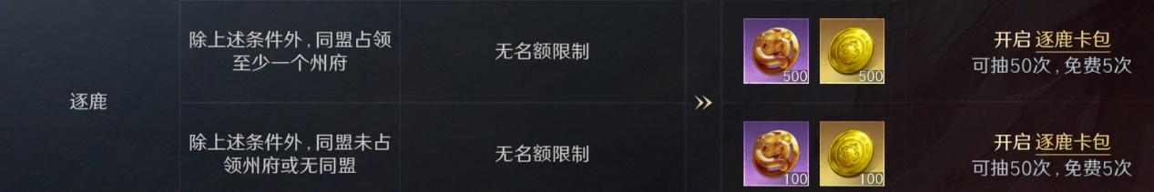 若主公所在同盟未占领州府,或未加入同盟,则可获得名望点*100,黄金*100,以及开启逐鹿卡包。