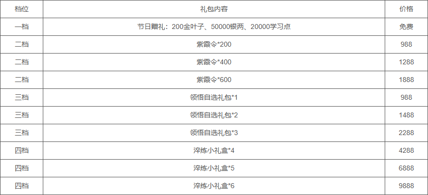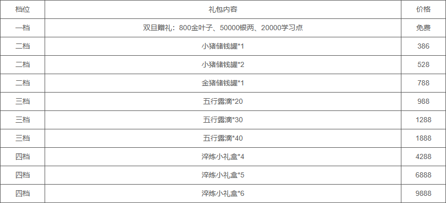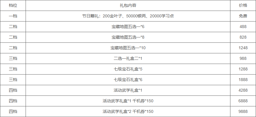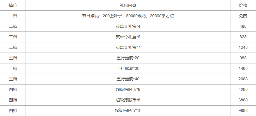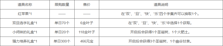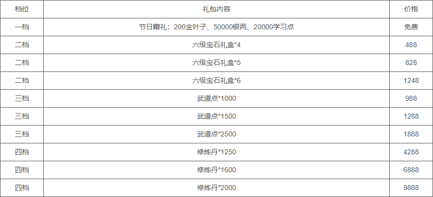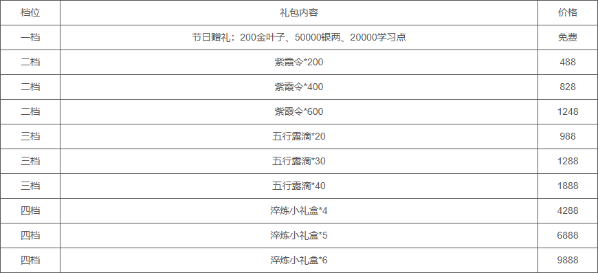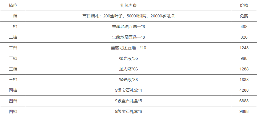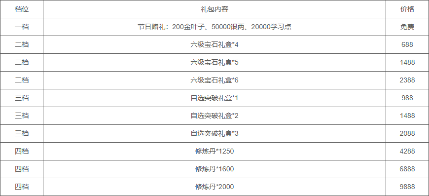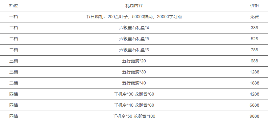 活动一:活动期间将限时上架节日礼包,礼包内容如下: