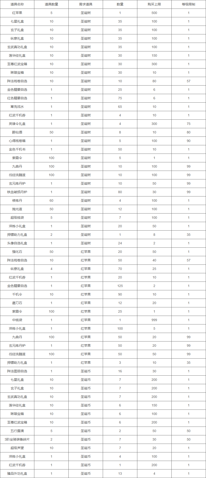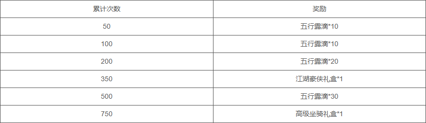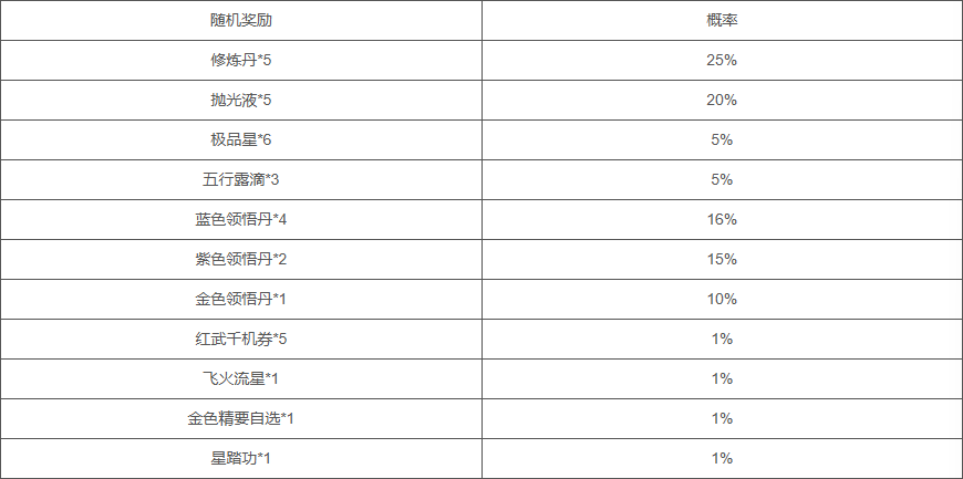随机奖励:有概率可获得修炼丹、抛光液、极品星、五行露滴、蓝色领悟丹、紫色领悟丹、金色领悟丹、红武千机券、飞火流星、金色精要自选、星踏功;
