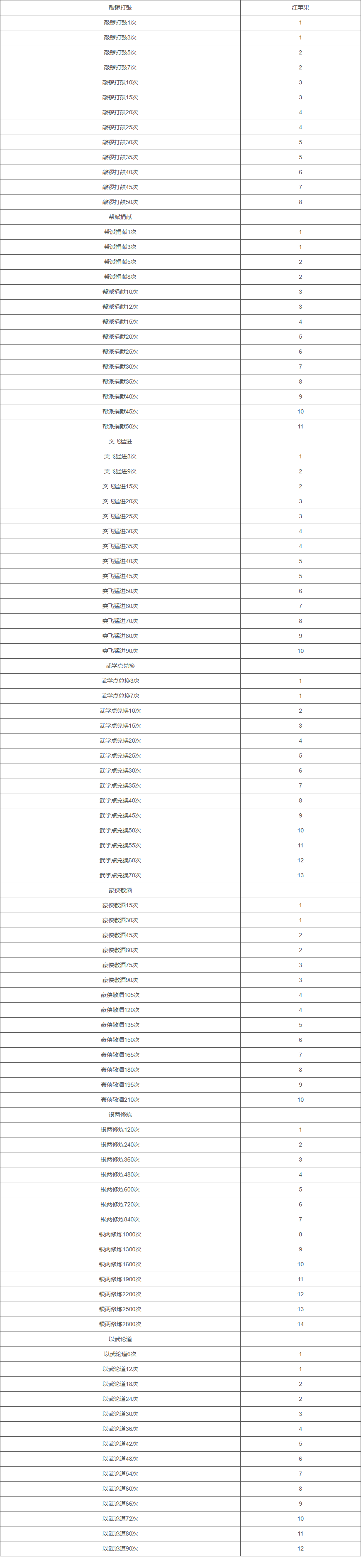 活动期间,通过“江湖磨砺”挂机,在挂机次数内必定掉落“双”、“旦”、“快”、“乐”集字道具中其中1个,集齐四个字可兑换道具“红苹果”,收集“红苹果”可以兑换各式好礼。
