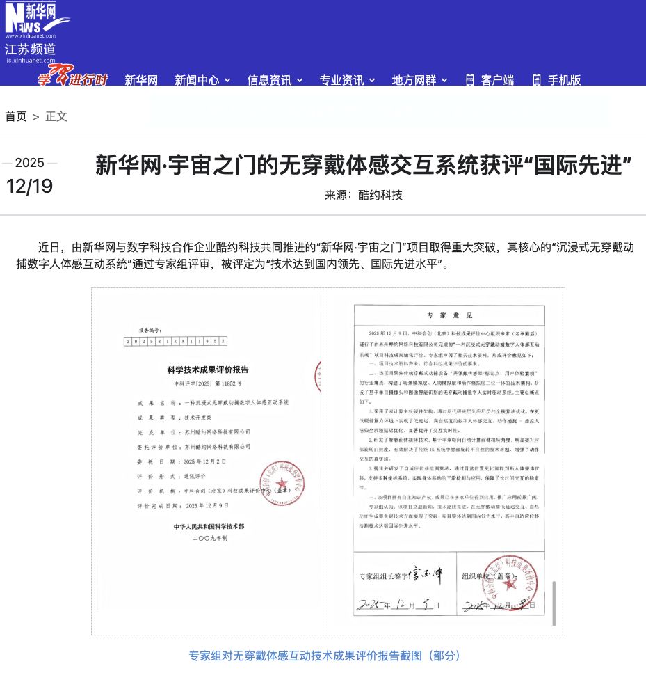 日前,新华网(江苏频道)发布最新报道:由新华网与数字科技合作企业酷约科技共同推进的“新华网·宇宙之门”项目成功取得重大突破,其核心的“沉浸式无穿戴动捕数字人体感互动系统”通过行业专家组评审,正式被评定为“技术达到国内领先、国际先进水平”。