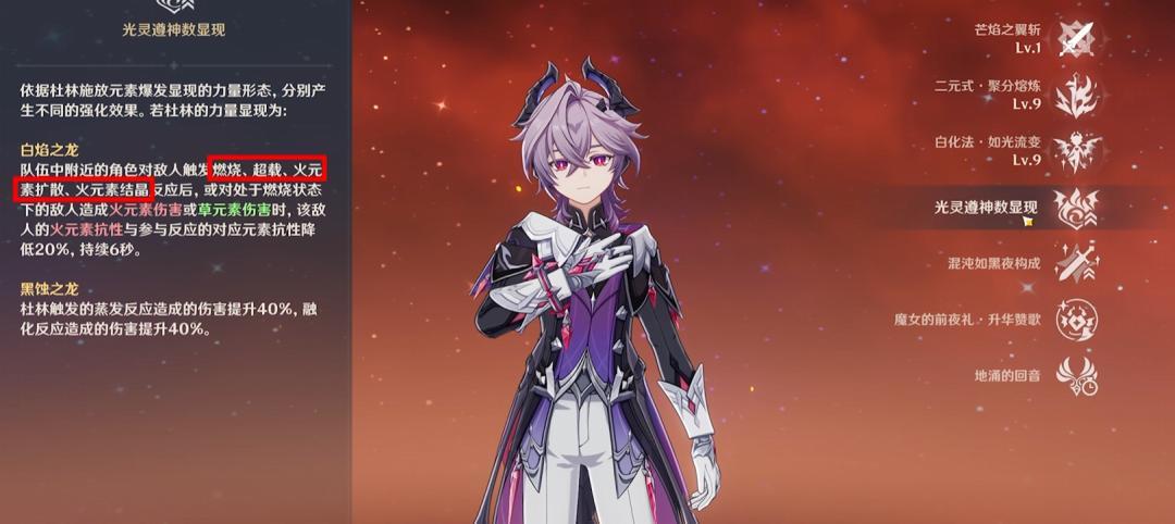 今天看到一位大佬推出了一个杜林的新阵容,并且这个阵容的舒适度相当之高,在一般的深渊环境下,甚至还不需要担心被怪物打到,因为他能够像恰斯卡一样浮在空中,并且他的浮空几乎是处于全程浮空状态,剩下的时间也就只有切人放技能的时候会处于地面状态了。因为得益于杜林的白龙形态,能够群体挂火跟减抗,并且可以减燃烧,超载,扩散以及结晶反应的元素抗性,所以这位大佬拿出了让我意想不到的两个角色,一个是调香师用于跟杜林打燃烧反应,另外一个是梦见月作为前台角色还可以触发扩散反应。