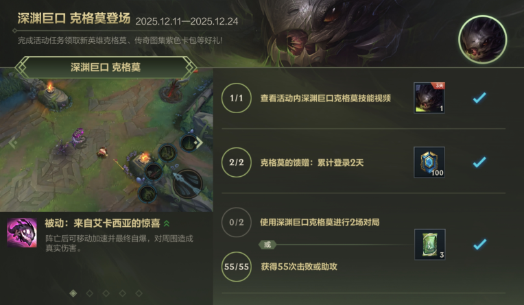 新英雄克格莫带来的“见面礼”大家都领取了吗?截止至12月24日(明日),召唤师完成活动任务即可领取新英雄克格莫、传奇图集紫色卡包等好礼~