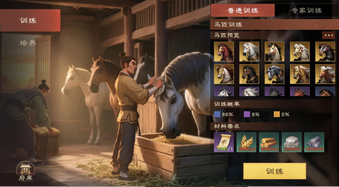 可使用百骏图+资源训练马匹。普通训练与专家训练获得马匹不同阶级的概率不同。