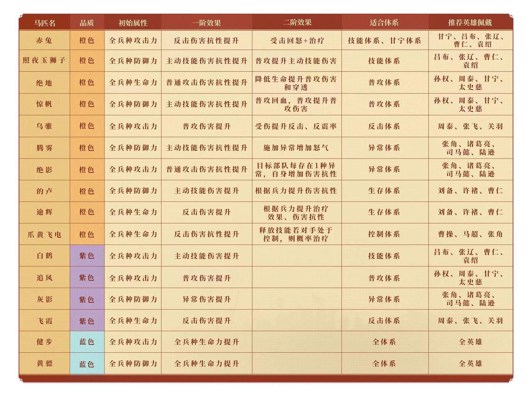 此处主公们需根据自身队伍,选定具体的马匹进行培养。每匹马适合的阵容体系各不相同,具体搭配可以参考下表: