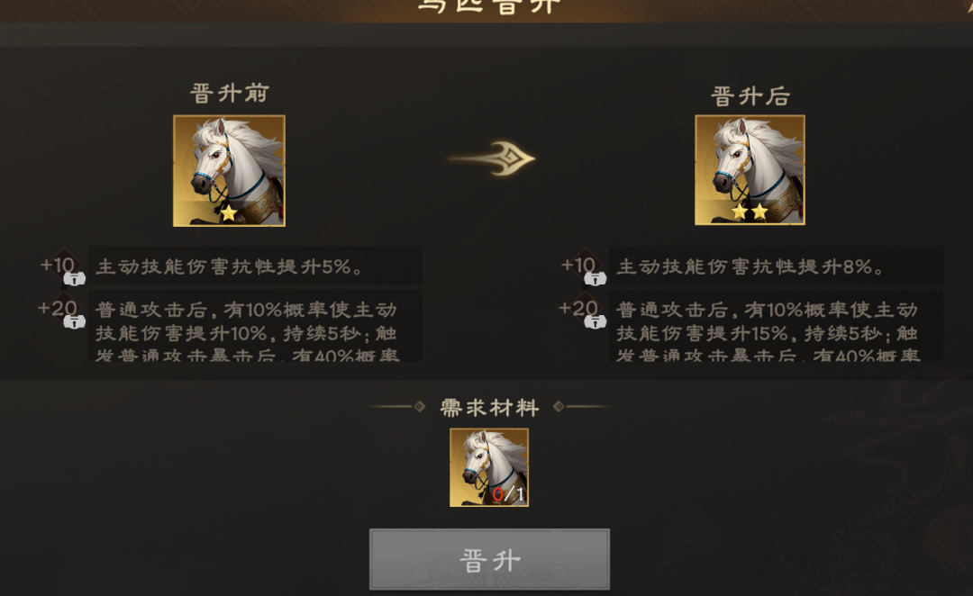 可使用同名马匹晋升,最多可晋升至5阶,提升马匹属性词条的数值。