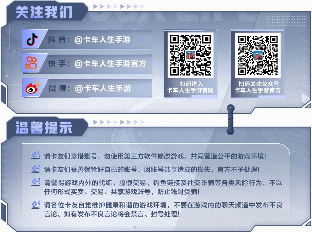 更多内容爆料敬请关注小卡的后续资讯~关注官方公众号【卡车人生手游官方】,获取公众号独家礼包和精美壁纸。