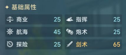 属性方面,初始高达65的指挥属性,让他成为仅次于艾伦的副舰长,这也让商人玩家没有后顾之忧,不用去担心因为更换他,而导致货舱提升不大。