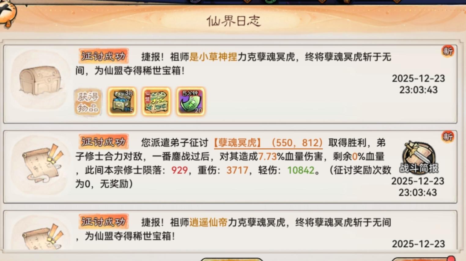 裂隙石的用途就是在搜寻那里使用开出一个孽魂冥虎,被击杀之后开出者可以获得一个四阶材料箱子,击杀者可以获得一个箱子(仙盟共享,人皆有之)和250W灵石以及一些治疗符,需要注意的是每人每天有5次征伐获得奖励的机会,征伐是不需要体力的,所以这5次一定要拉满,毕竟有概率出四阶材料,但是每次征伐都会损耗兵,故有蛊修大佬可以去抢人头,但不是特别有必要,随缘吧。