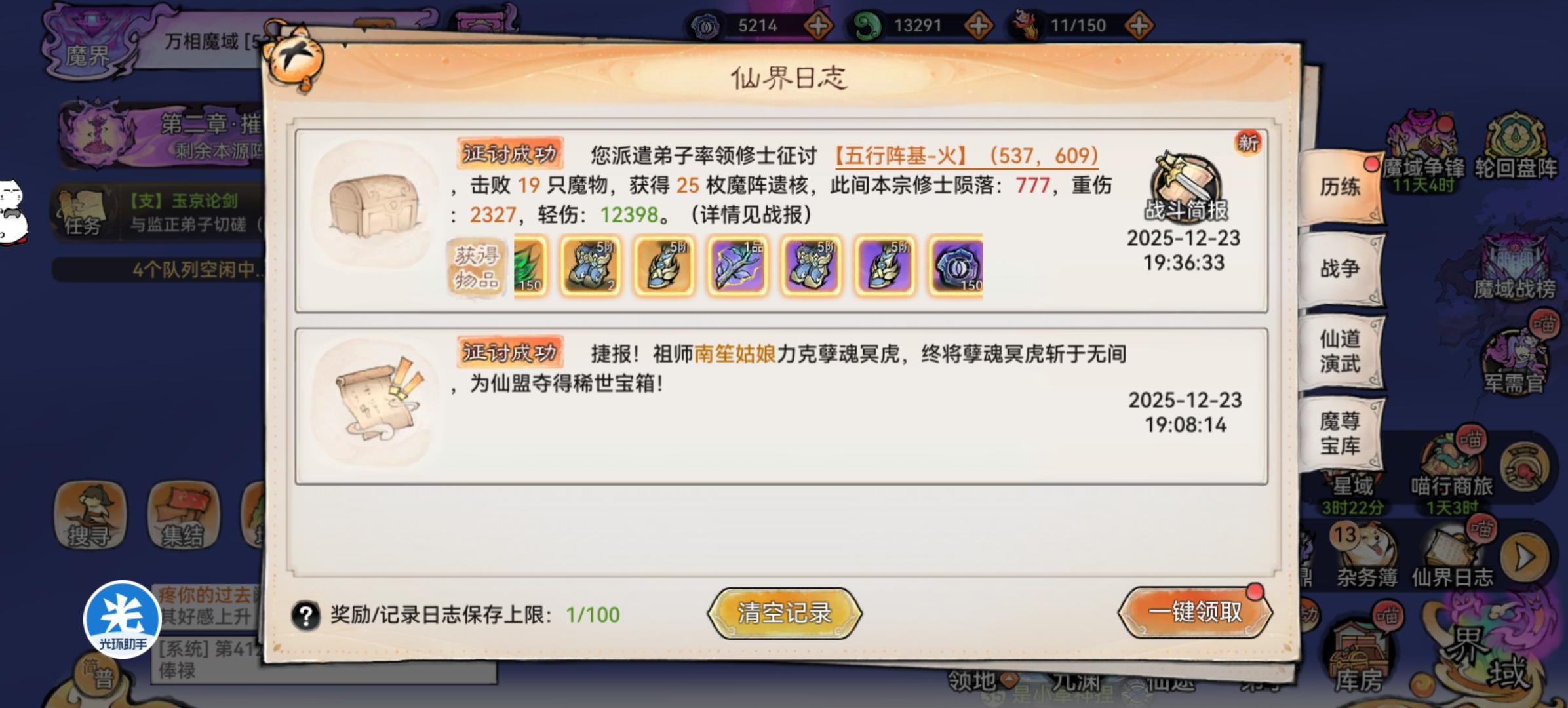 1个五行阵基有3万个魔阵遗核,我们需要将魔阵遗核全部抢走才算摧毁,每进攻一次可以拿走150个魔阵遗核,每一个阵基需要进攻200次,然后就是进攻还可以获得150 万相魔魂(相当于12阶首领),万相魔魂是去炼魂鼎抽奖的,具体有新的仙魔装备、裂隙石、灵秀碎片和古宝,个人目前开出了一个仙舞的装备以及一次出两个裂隙石。