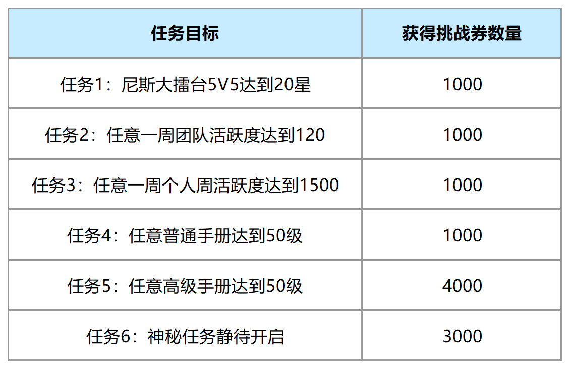 活动规则:活动时间内完成指定任务可获得对应数量的“挑战券”,用于在活动商城中兑换道具。