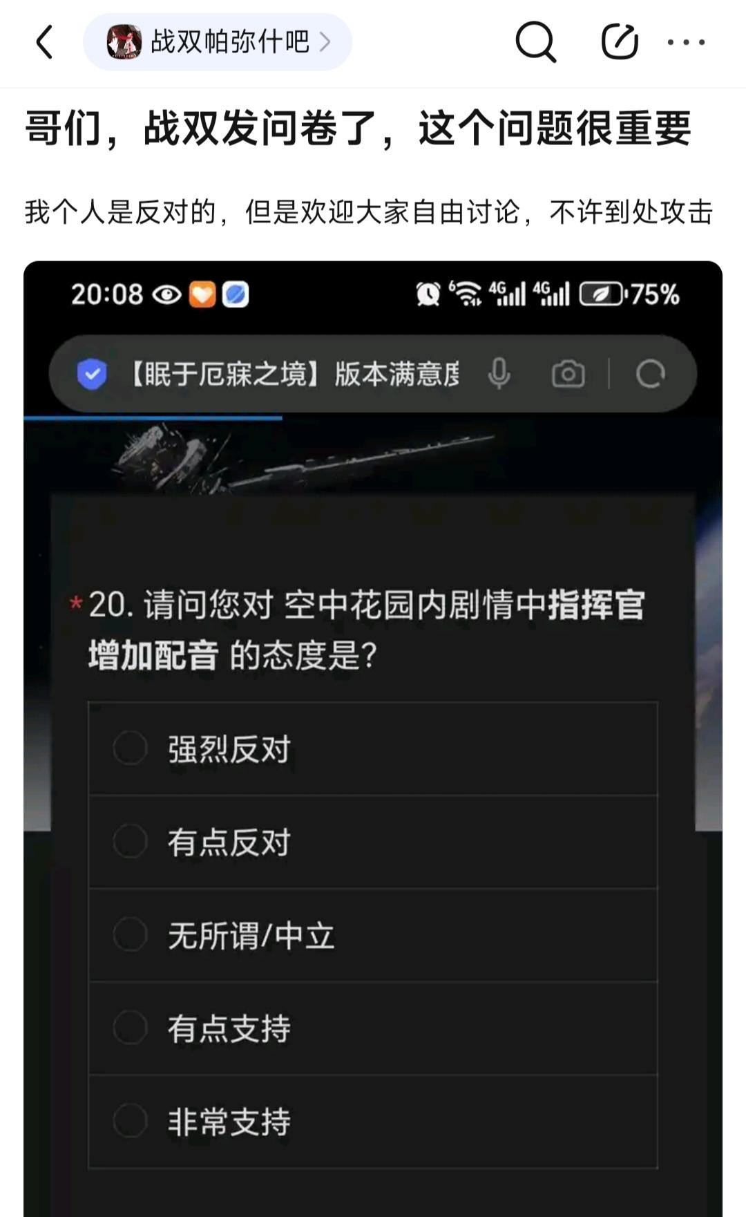 据悉在此次版本中,官方在问卷中增加了【玩家对指挥增加配音的态度】一事的调查