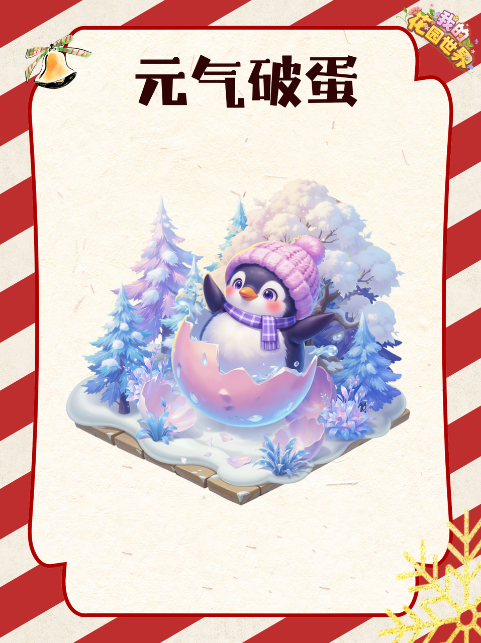 🥚【元气破蛋】小企鹅正扑棱着翅膀从"破蛋"钻出来,连小爪子都透着雀跃的劲儿✨,周围是淡紫调的雪松,把冬日的软萌与元气全揉在了一起~