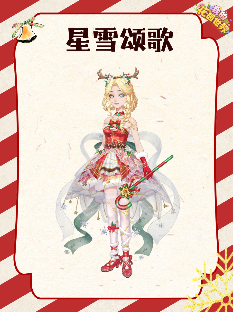 👗【星雪颂歌】麋鹿角发饰衬得金色编发更显软萌,红金撞色的圣诞短裙亮眼又精致,层层叠叠的甜系纱裙漾着光泽,手里的拐杖糖甜意满满,像从圣诞糖罐里钻出来的元气少女。