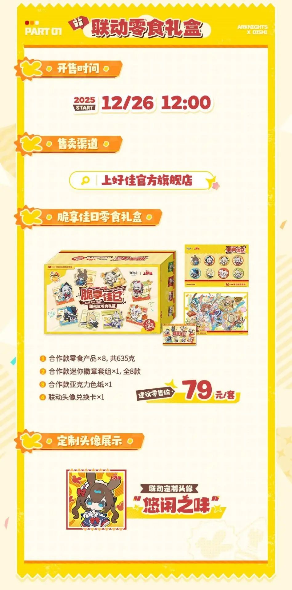 近日,明日方舟与上好佳的联动合作“脆享佳日”正式官宣,联动零食礼盒将于2025年12月26日在线上渠道开售,售价79元/套。此次联动精选八位高人气干员,为其量身打造专属零食,并将同步推出限定虚拟头像与精美实体周边