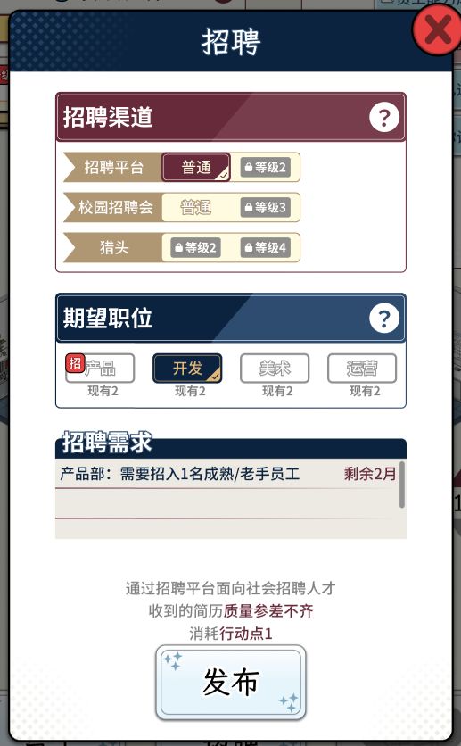 今天要介绍的是核心的招聘系统,游戏给予玩家极高的自由度:你可以根据目前公司的情况选择合适的招聘渠道和目标职位,是着眼未来寻找潜力股还是快速补充即战力,是广撒网还是逐个击破,都由你决定。