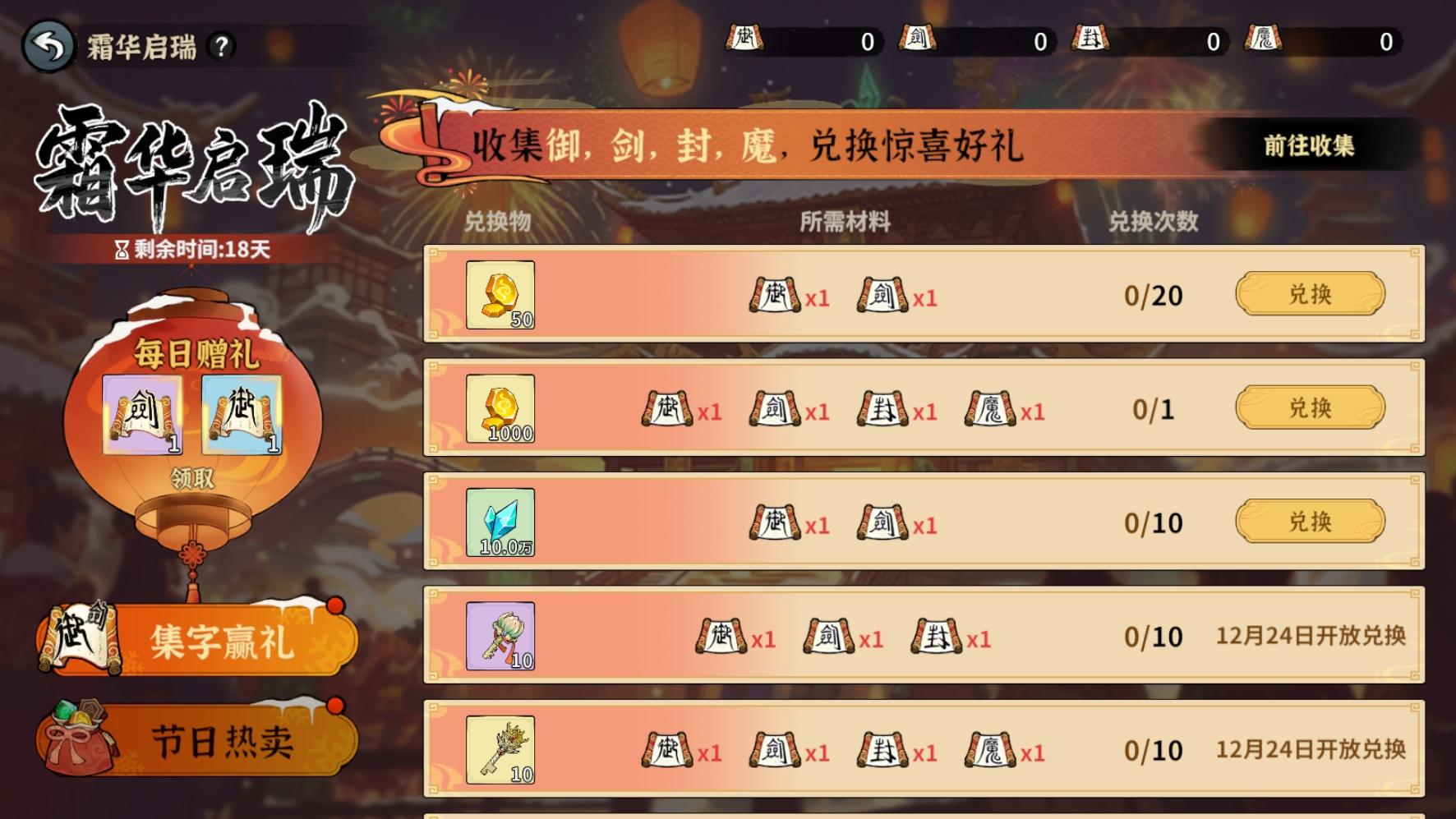 活动期间参与 鸿蒙残阵,可收集《御》《剑》《封》《魔》四字。