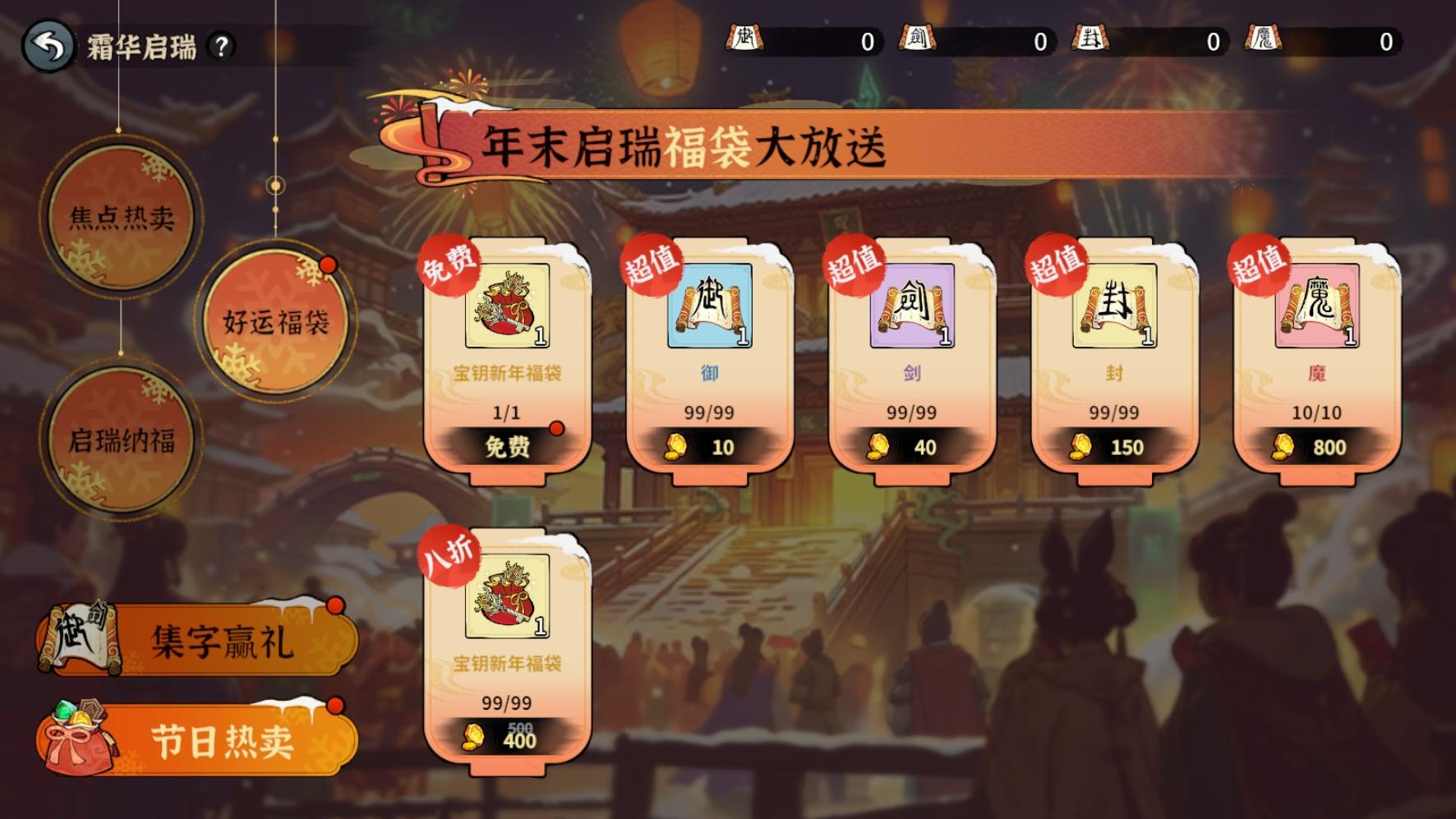 多款福袋随机开启,内含宝钥与集字活动道具,惊喜不断。