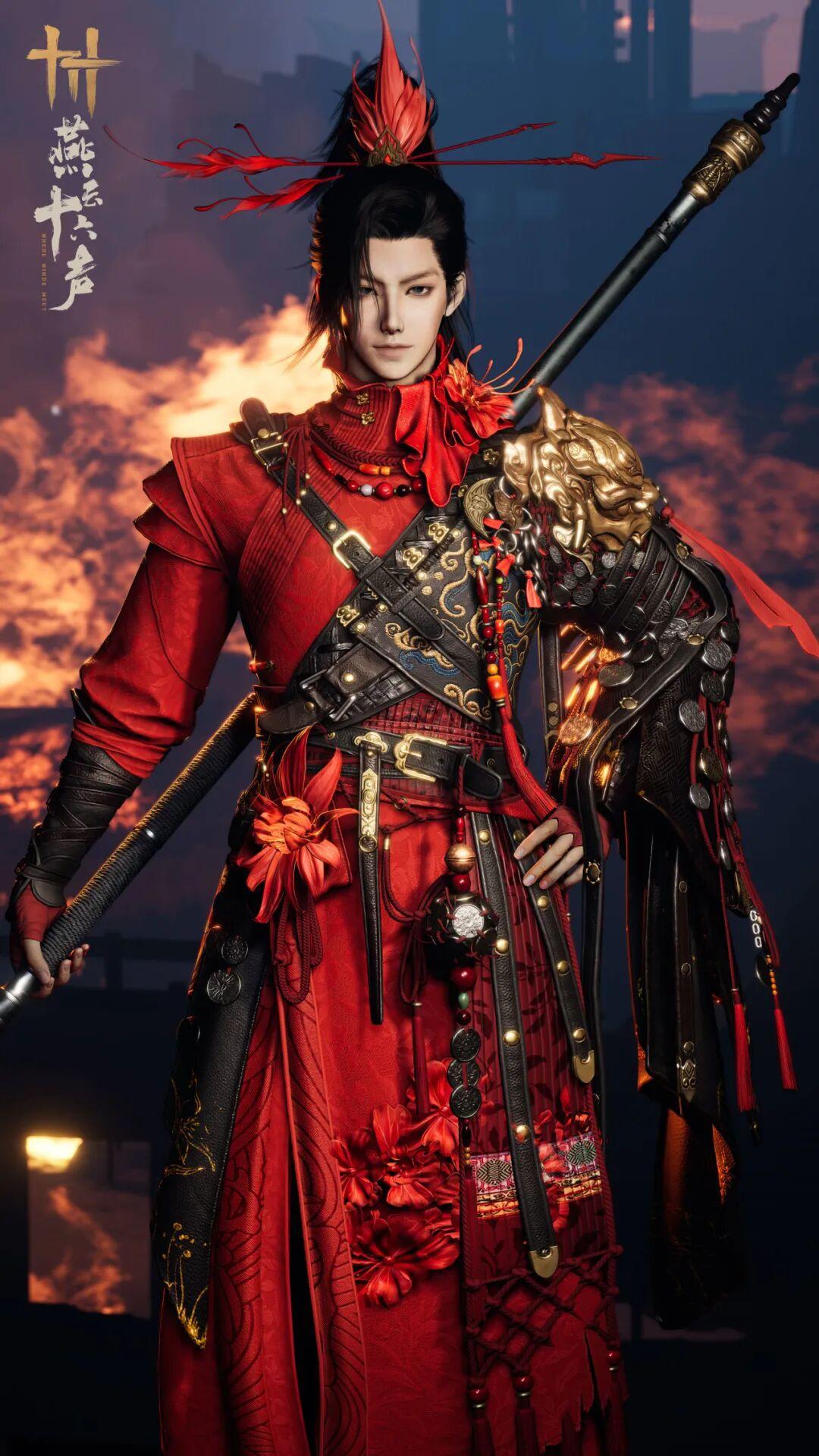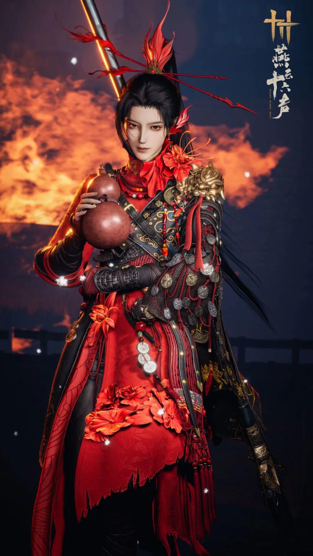 此套装以红黑为主调,衣袍中融入兽吞甲胄元素,亦有朵朵血色红花缀于此间。发间红羽与手中兵器相衬,既带侠客的自在飘逸,又凝着战场之肃杀豪迈。