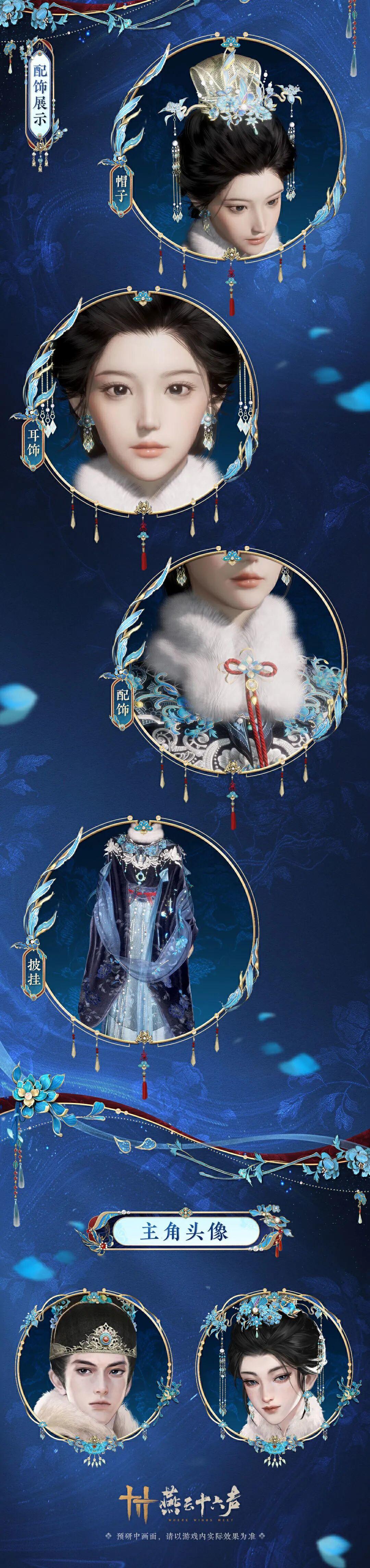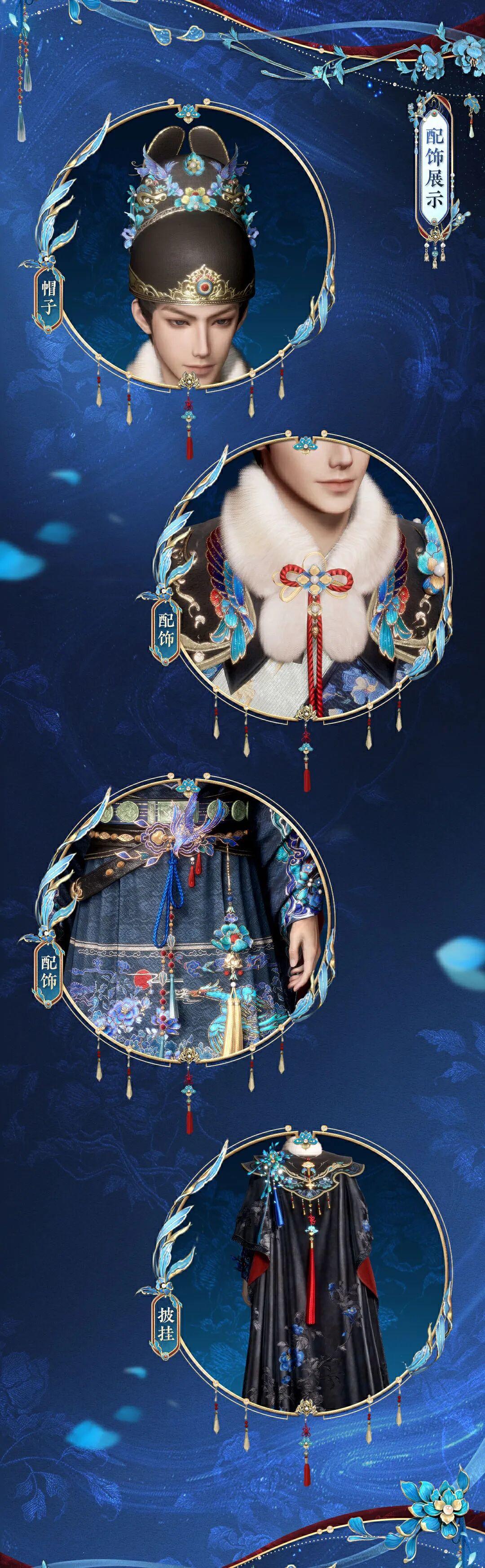 此套装取意于青鸟神韵。翠羽加冕间,古典华光毕现;翠蓝光泽下,堂皇中透着清雅。女款发式取鬏髻之雅意,云肩叠缀蓝花,珍珠链轻垂,宛如听见青鸟啼鸣的清音。男款头冠改翼善之形,威仪自成,硬肩披风以刺绣缀有苍青,凌凌侠气兼有雅致气韵。