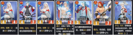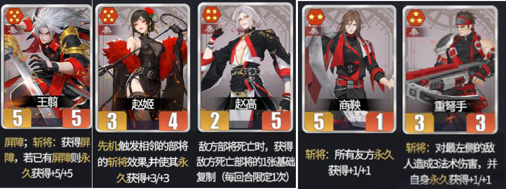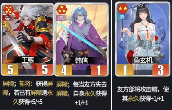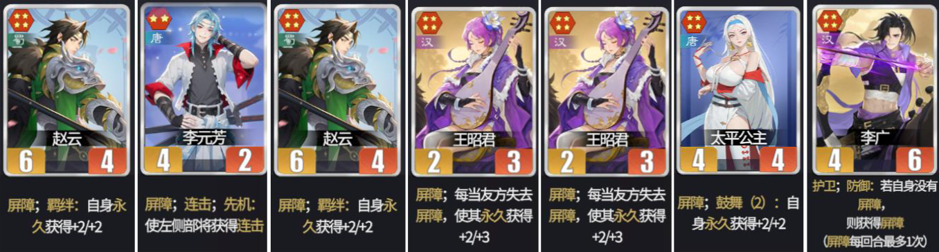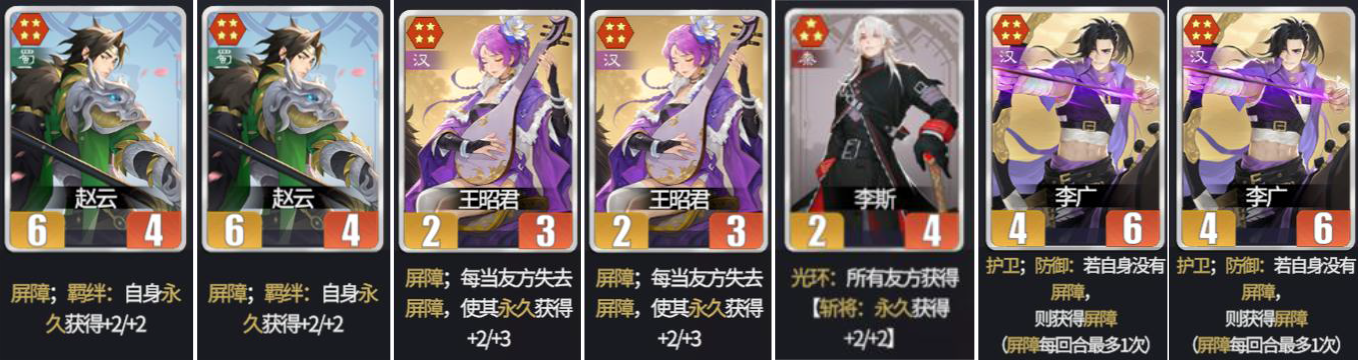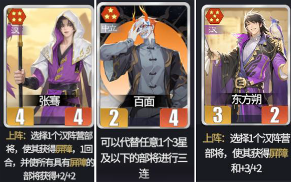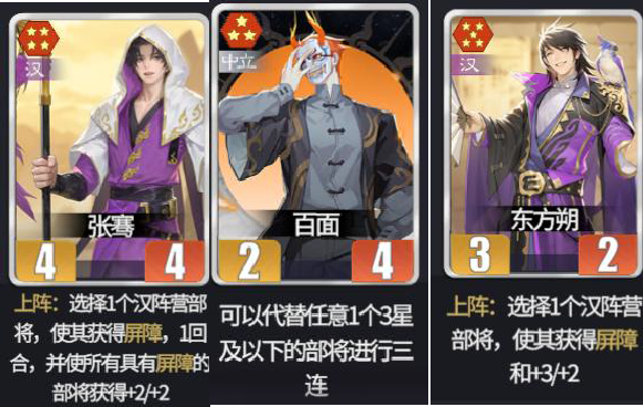辅助牌(把他拿了往没有盾的汉身上一套,带盾的全体加攻击力,在没有三张带盾的牌前不 要拿)