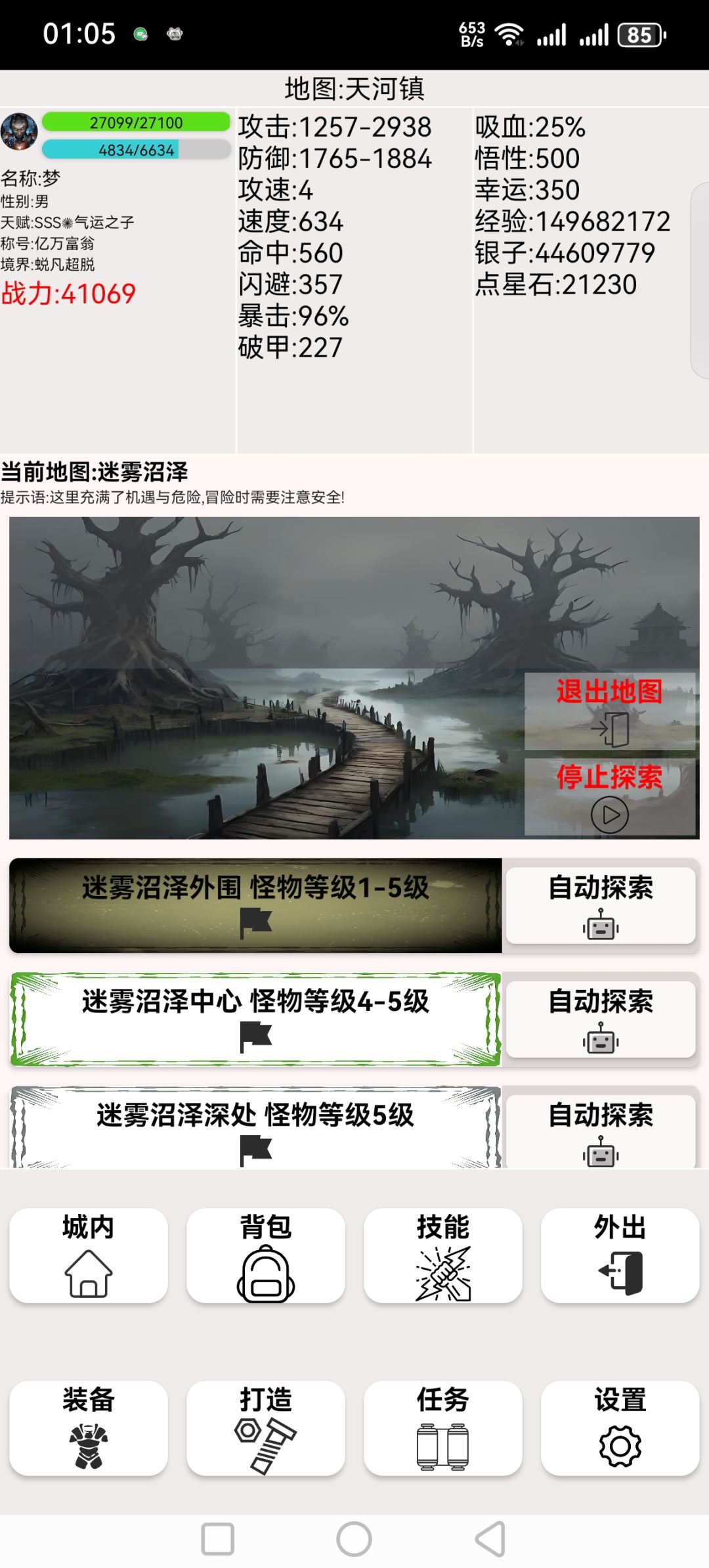 2:(进阶玩法)学完门派功法升级完成,点外出,地图,选择迷雾沼泽,迷雾沼泽外围,自动探索,等待遇怪,战斗,战斗结束。现在外围刷一套基础防御装备,掉落什么装备穿什么装备,不用挑,属性统一的。穿满四件装备后可以考虑打一下中心,中心出精良装备,穿上,期间可以点停止探索,退出地图,去门派里升级内功,要点满一百级才能出师,别怕浪费,穿满可以打深处,特别提醒,非常关键,一定要看,深处有史诗匕首,可以一直用到图三,蛇王匕首,打出来了可以一直留着用到图三,