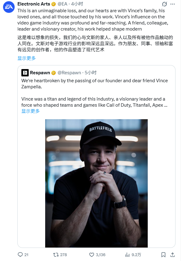 Respawn所属的美国艺电(EA)随后证实了这一消息,Infinity Ward、Battlefield等多家工作室也发表了声明和悼念。