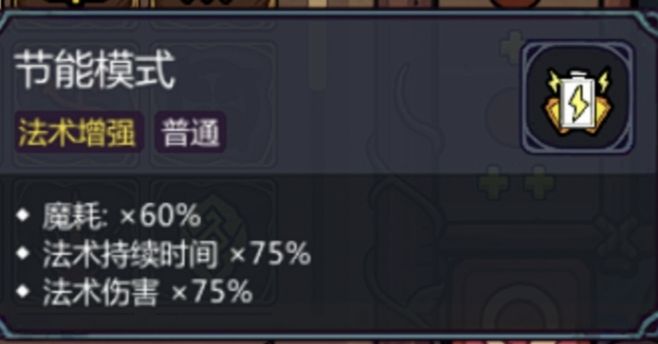注意,节能模式的负面buff会减少法术存在时间所以说要带几个时间强化来抵消负面的buff