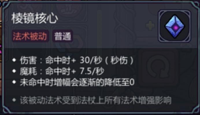 棱镜核心最重要的,频率高,而且自动,吃法杖的上所有的增益不分前后(有多重一个变俩,有分裂一个变仨)