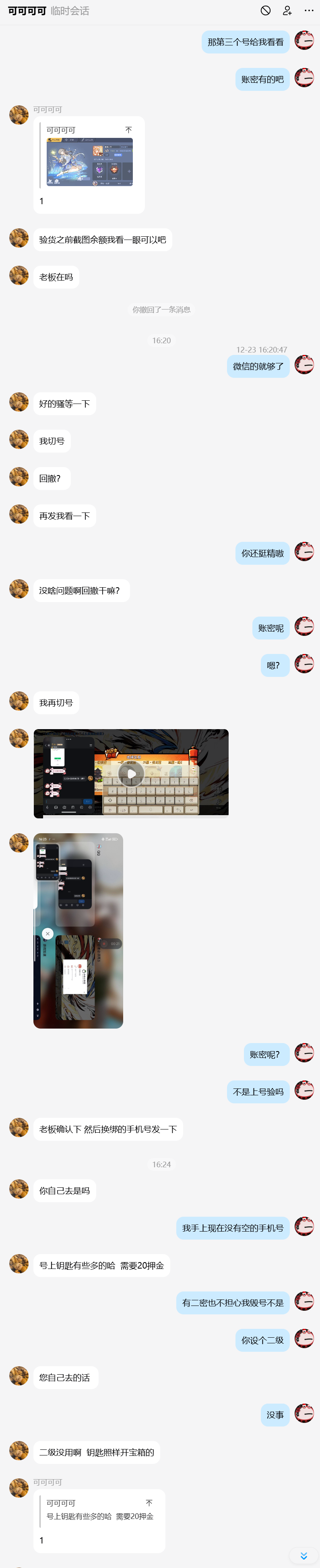 从游戏外的长截图可以看到,最终他并非是想骗取买卖账号所需要花的💴,而是要骗取所谓的“验号押金”。其实你聊到一半,觉得生意能成的时候,这20块钱很容易就给出手了。其实就是利用了买号人的侥幸心理——