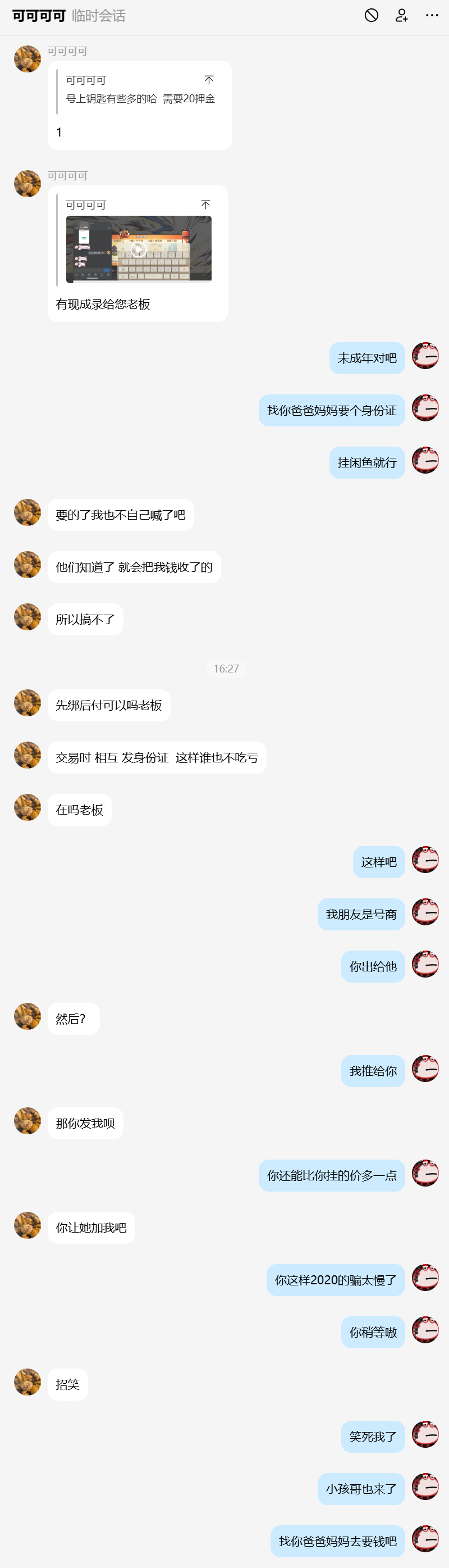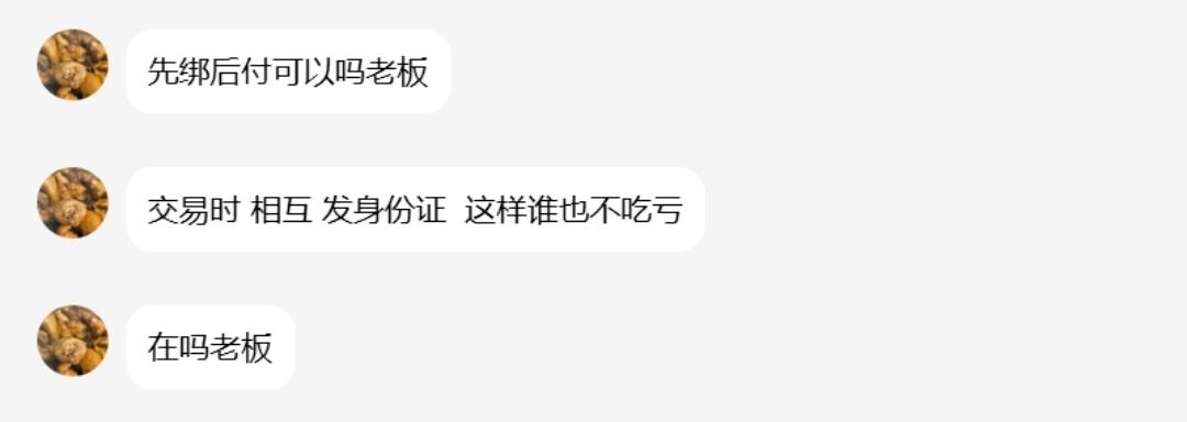 可以看到,他对自己的“先绑后付”相当自信,好像我确实可以走这样一个对卖家不公平的非常规流程买到价格相当便宜的号。而且可以看到,即使我多次提及走平台交易,他也要引导我私下交易,那么接下来我就遂了他的愿: