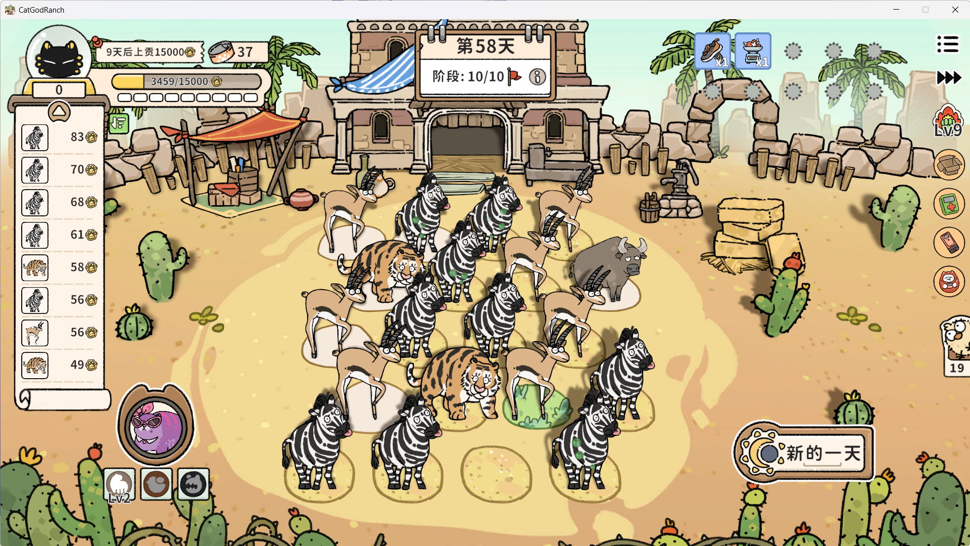 成型阵容大致如图(高级动物和道具遇到有用的就也要拿,我不拿是为了测上限)
