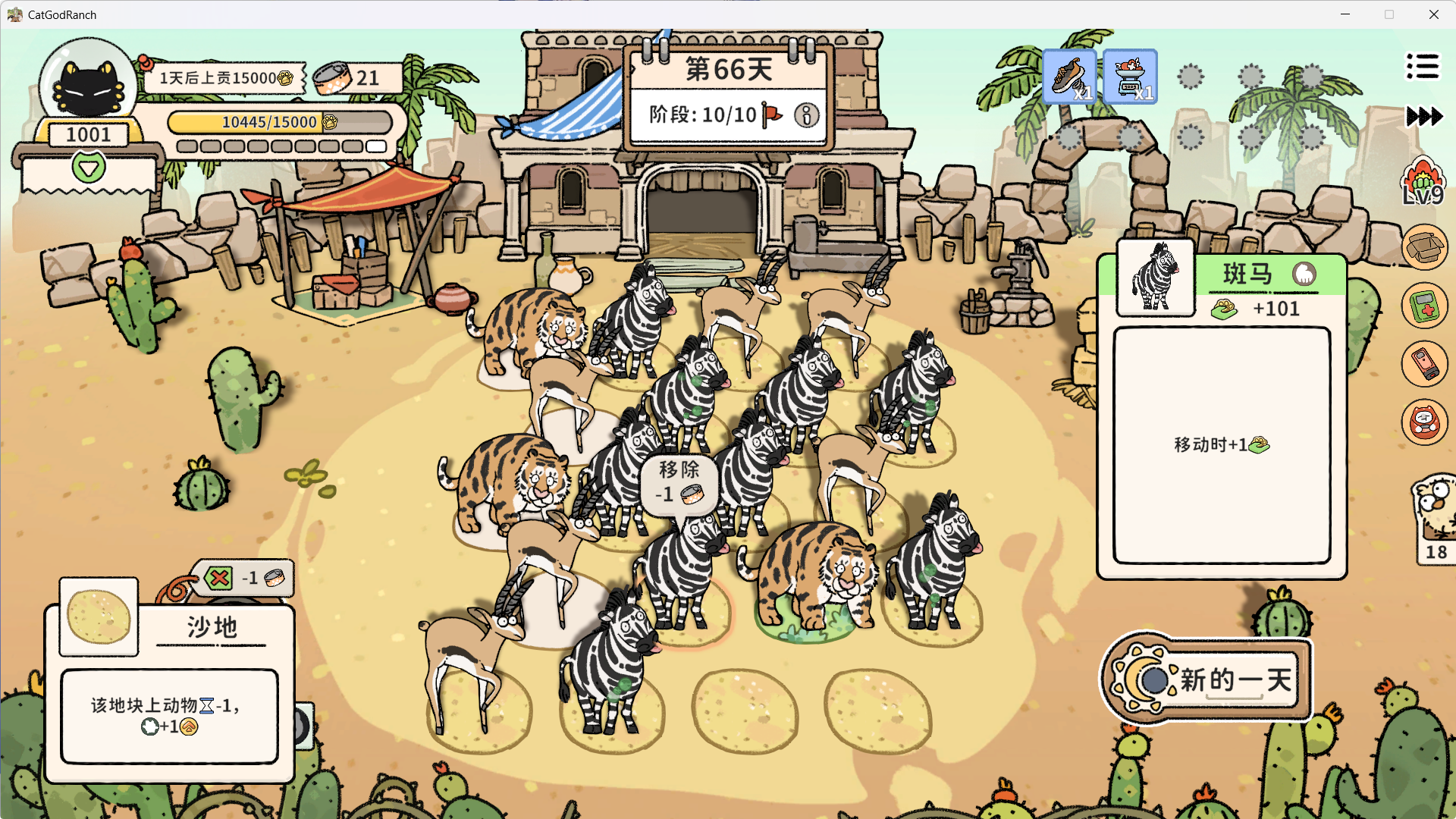 思路:斑马移动会增加贡献,被捕食就移动,也能再次增加贡献。于是就利用老虎多次捕食斑马,每次可增加3贡献。瞪羚和斑马都是稀有动物,选到概率很高;其他有蹄遇到也都可选,喂给老虎就行。