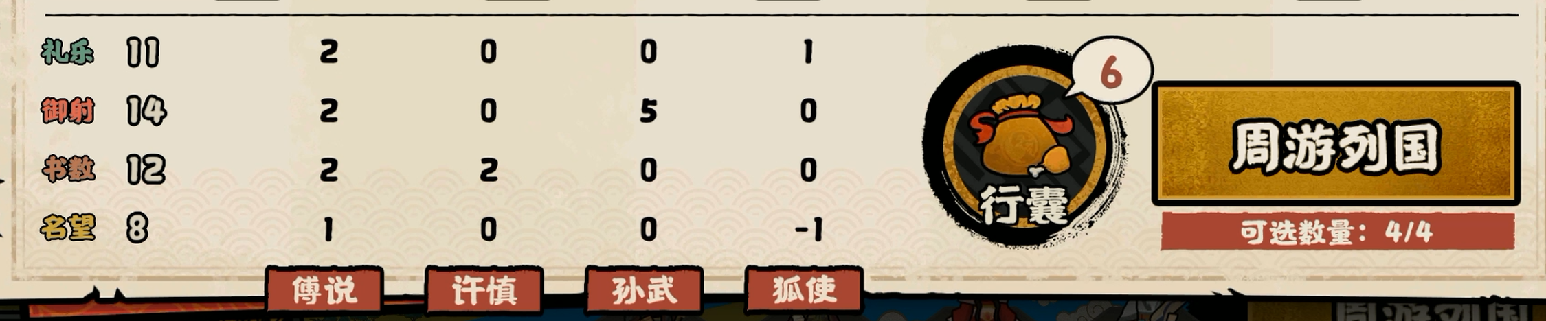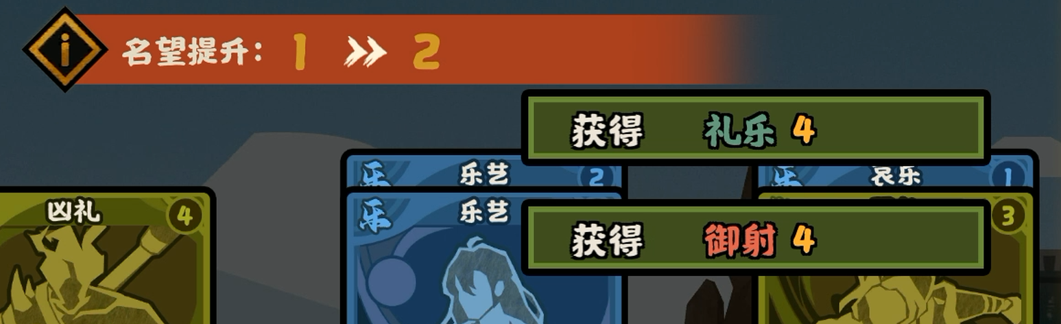 而升级获得卡牌的气数,也就是右上角的这个费用,也会加到孔子的对应三维属性上。比如齐鲁会盟之前孔子的三维属性是礼乐11、御射14、书数12。齐鲁会盟之后名望升级获得这3张新的卡牌之后,【凶礼】属于礼乐,气数是4,所以礼乐加了4点属性变成15。【逐水曲】和【过君表】属于御射,气数加起来也是4,所以御射也加了4点属性变成18。最终孔子的三维属性就变成了礼乐15、御射18、书数12。