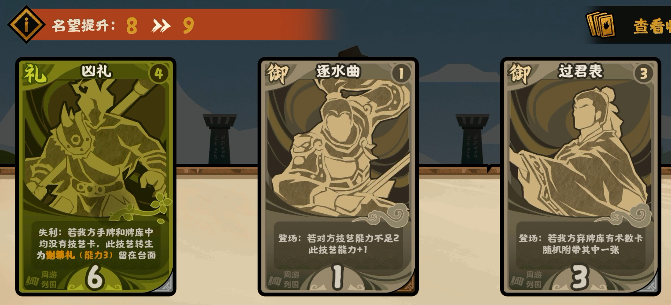 六艺录中的卡牌是一次解锁终身可用。孔子的卡牌是每局游戏开局都只有几张基础卡牌,后续通过提升孔子的名望等级来获取,每升一级就能随机获得3张六艺录中已经解锁的卡牌。比如打赢齐鲁会盟的战斗后,孔子名望升级获得的3张卡牌,按我这局游戏的三维属性还不能解锁【凶礼】和【过君表】这两张卡牌,但是因为上一局游戏已经把他们在六艺录中解锁了,所以就有概率能直接获取。