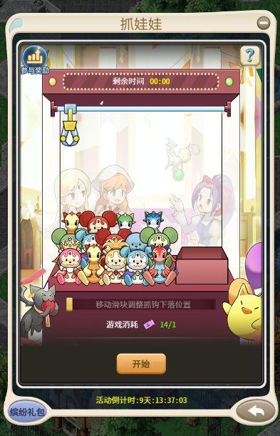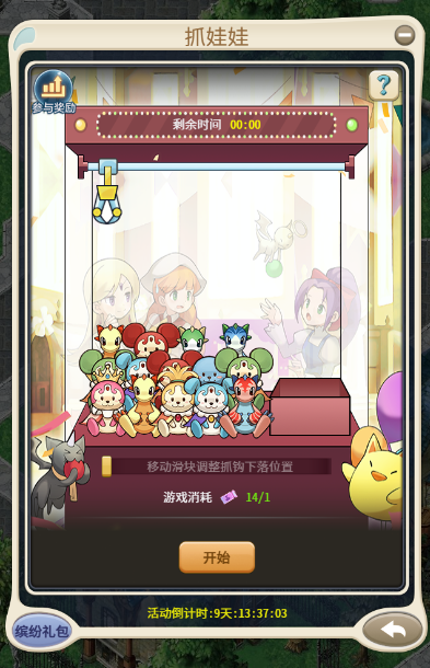 消耗游戏券可体验抓娃娃小游戏,点击下方滑块可移动抓钩,抓到的娃娃可出售换取魔币,参与小游戏还可获取嘉年华奖券