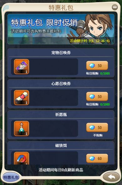 能以更加优惠的价格购买到宠物召唤券、祈愿瓶、磁铁饵和游戏券