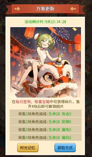 在迷宫和试炼中挂机有概率获得活动道具,可合成元旦灯笼。往期抽奖道具可兑换为本期抽奖道具