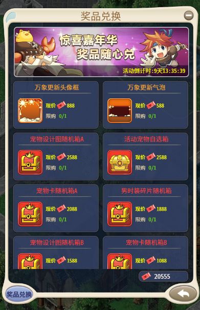 通过在小游戏获取的嘉年华奖券可在奖品兑换中兑换万象更新头像框和气泡、宠物卡随机箱A、活动宠物自选箱、时装碎片等奖励